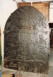 St Saviour's Church was constructed in 1335 and consecrated in 1372. It contains a pre-Reformation oak rood screen built in 1480 and several monuments including the tomb of John Hawley (died 1408) and his two wives, covered with a large brass plate effigy of all three. A large medieval ironwork door is decorated with two leopards of the Plantagenets and is possibly the original portal. Although it is dated "1631", this is thought to be the date of a subsequent refurbishment coincidental with major renovations of the church in the 17th century.[11] The gallery of the church is decorated with the heraldic crests of prominent local families and is reputed to be constructed of timbers from ships captured during the defeat of the Spanish Armada,[12] although this has not been categorically substantiated. An engraving of a painting by Thomas Allom of the interior of the church, showing the rood screen, provided the inspiration for Letitia Elizabeth Landon's poetical illustration Dartmouth Church in Fisher's Drawing Room scrap Book, 1833.[13]