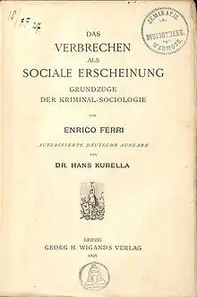 Das Verbrechen als soziale Erscheinung; Grundzüge der Kriminal-Sociologie (translated to English: Crime as a Social Phenomenon; Outlines of Criminal Sociology) was written by Enrico Ferri and originally published in 1884, but has undergone several revisions since then. It deals with Ferri's perspective on criminal sociology and problems of penology. The book is known as Ferri's most important work and represents the positive school of criminology.[1]