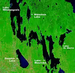 Dauphin Lake is located in western Manitoba near the city of Dauphin, Manitoba. The lake covers an area of 201 square miles (520 km2) and has a drainage basin of about 3,420 square miles (8,900 km2).[1] The Mossy River drains the lake into Lake Winnipegosis. The basin is drained by seven major streams and has a total relief of 1,900 feet (580 m).