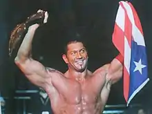 Batista holding the World Heavyweight Championship and a flag of Puerto Rico in 2006