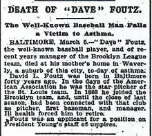 - ↑ "Death of "Dave" Foutz – The Well-Known Baseball Man Falls a Victim to Asthma". New York Times. March 5, 1897. p. 2. Retrieved 9 March 2018.