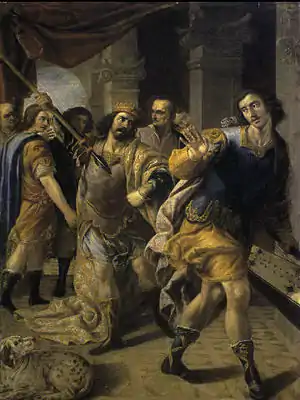 When David is old and bedridden, Adonijah, his eldest surviving son and natural heir, declares himself king.[78] Bathsheba and Nathan go to David and obtain his agreement to crown Bathsheba's son Solomon as king, according to David's earlier promise, and the revolt of Adonijah is put down.[79] David dies at the age of 70 after reigning for 40 years,[80] and on his deathbed counsels Solomon to walk in the ways of God and to take revenge on his enemies.[81]