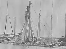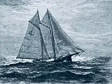 She was registered as a Schooner with the Record of American and Foreign Shipping, from 1887 to 1900. Her ship masters were Edward Nichols (1887-1890) and Hawkins (1891-1893); built in 1885 at City Island, New York; and her hailing port was the Port of New York. Her dimensions were 77.5 ft. in length; 21.5 ft. breadth of beam; 8.4 ft. depth; 66-tons; and her masts were 73 ft and 71 ft; featuring a plum bow.[7] On her mainsail was the large letter "4", that identified the boat as a Sandy Hook pilot boat; along with a pennant flag with the name David Carll.