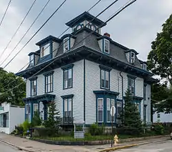 The 2+1⁄2-story, wood-framed house was built in about 1858 and remodeled in a Second Empire style to a design by Clifton A. Hall in 1867. It has a mansard roof with flared eaves studded with brackets, and bracketed bay windows on two sides. The interior was gutted when the house caught fire in the 1960s.[2]