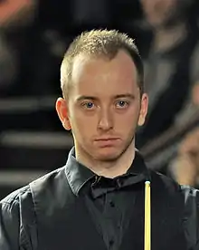 In the 2014–15 season, Morris qualified for the Wuxi Classic and the International Championship but lost in the first round of both tournaments.[14][15] For the second successive year he reached the fourth round of the UK Championship, defeating Li Hang 6–4 in the first round before beating reigning world champion and world number one Mark Selby 6–4 in the second round, a victory that was described as the most significant win of his career to date.[16] He went on to defeat David Gilbert 6–2 in the last 32,[17] but lost 3–6 to Stephen Maguire in the last 16.[18] Morris beat Joe O'Connor 4–0 at the Welsh Open, but lost by a reversal of this scoreline in the second round against Neil Robertson.[19] He qualified for the Indian Open and the China Open, losing 4–0 to Graeme Dott in the second round of the former and 5–1 to Stephen Maguire in the first round of the latter.[19] Morris ended the season at a career-high 51st in the world rankings.[20]