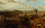 In 1851, and again in 1853, Roberts visited Italy, painting the Ducal Palace, Venice, bought by Lord Londesborough, the Interior of the Basilica of St Peters, Rome, Christmas Day, 1853, and Rome from the Convent of St Onofrio, presented to the Royal Scottish Academy.[13]