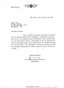Zeiger participated from the beginning in the textile fairs established by Caio de Alcântara Machado (FENIT), the board of directors of the International São Paulo Art Biennial,[3] and sponsored a project aimed at integrating a cultural center with theaters and concert halls in the Ibirapuera Park. He was also an art collector. In his view, the city of São Paulo had the potential to become the most important metropolis in Latin America.
