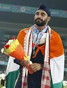 Davinder Singh Kang (born 18 December 1988) is an Indian track and field athlete who competes in the javelin throw event. Kang won the bronze medal at the 2017 Asian Athletics Championships with a throw of 83.29m.[2] At the 2017 World Championships in Athletics in August 2017, he became the first Indian to qualify for the final of the javelin throw event at the World Athletics Championships with a throw of 84.22m, the seventh best mark in the qualification round.[3][4]