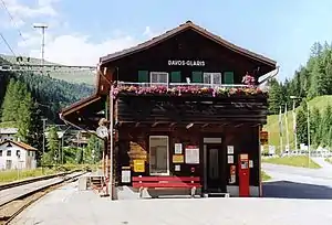 The station buildings of Frauenkirch, Monstein and Wiesen are located to the west of the tracks, but the Glaris station building is to the east.