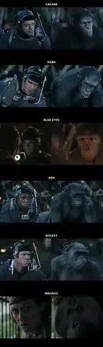 Malcolm warns Caesar of the approaching human military. Believing that the humans will never forgive the apes for their attack, Caesar orders Malcolm to evacuate with his family for safety before the fighting begins. After Malcolm leaves, Caesar then addresses the apes as they prepare for the upcoming war.
