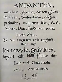 The manuscript is an in folio of 80 sheets, 320 by 205 millimetres (12.6 by 8.1 in) in size. The pages, beginning on the second sheet, are numbered 1 to 152 and are followed by a table of contents at the end.[14] The front page of the manuscript is titled "ANDANTEN, / marchen, gavotte, Ariaen, giúen, / Corenten, Contre-danſen, Allegros, / preludies, menuetten, trion, &. &. / Voor. Den. BEŸAERT. OFTE. / kLok-SPIL. / Bÿ een vergardert ende op geſtelt. / Door mÿ / Ioannes, de, grúÿtters, / beÿart ofte klok-ſpilder der / ſtadt ende Chatedraele. / TOT, ANTWERPEN / 1746", which translates to "Andantes, marches, gavottes, arias, gigues, courantes, contra dances, allegros, preludes, minuets, trios, etc. etc. for the carillon or bell-play, gathered together and arranged by myself, Joannes de Gruytters, carillon- or bell-player of the city and cathedral of Antwerp, 1746".[14]