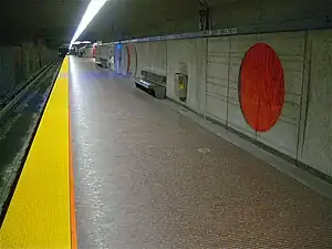 The station is decorated with a series of circular motifs in ceramic tile on the lower levels and concrete bas-reliefs in the upper levels by Claude Théberge and Antoine D. Lamarche.