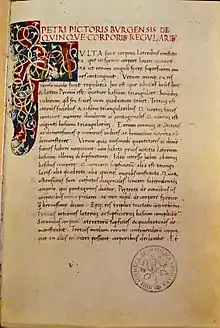 After its dedication, the title page of De quinque corporibus regularibus begins Petri pictoris Burgensis De quinque corporibus regularibus.[13] The first three words mean "Of Peter the painter, from Borgo", and refer to the book's author, Piero della Francesca (from Borgo Santo Sepolcro[7]); the title proper begins after that. A decorative initial begins the text of the book.