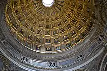 The fourth and final part of the book concerns other shapes than the Platonic solids.[18] These include six Archimedean solids: the truncated tetrahedron (which appears also in an exercise in his Trattato d'abaco), and the truncations of the other four Platonic solids.[19] The cuboctahedron, another Archimedean solid, is described in the Trattato but not in De quinque corporibus regularibus; since De quinque corporibus regularibus appears to be a later work than the Trattato, this omission appears to be deliberate, and a sign that della Francesca was not aiming for a complete listing of these polyhedra.[20] The fourth part of De quinque corporibus regularibus also includes domed shapes like the domes of the Pantheon, Rome or the (at the time newly constructed) Santa Maria presso San Satiro in Milan formed from a ring of triangles surrounded by concentric rings of irregular quadrilaterals, and other shapes arising in architectural applications.[21] The result that Peterson (1997) calls della Francesca's "most sophisticated" is the derivation of the volume of a Steinmetz solid (the intersection of two cylinders, the shape of a cloister vault), which della Francesca had illustrated in his book on perspective.[22] Despite its curves, this shape has a simple but non-obvious formula for its volume, 2/3 of the volume of its enclosing cube. This result was known to both Archimedes and, in ancient China, Zu Chongzhi,[23] but della Francesca was unaware of either prior discovery.[24]