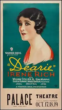Dearie is a 1927 American silent drama film produced and distributed by Warner Bros. and directed by Archie Mayo.[1] It is from a story by Victorian author Carolyn Wells about a woman who sacrifices for her ungrateful son. This film starred Irene Rich[2] and it is possible that the film may have been released with a Vitaphone soundtrack.