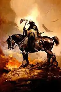 Death Dealer is a 1973 fantasy painting by American artist Frank Frazetta. It depicts a menacing armor-clad warrior with a horned helmet, whose facial features are obscured by shadow, atop a horse, holding a bloody bearded axe and shield. The image eventually led to spin-offs of varying merchandise, including subsequent paintings of the warrior, novels, statues, a comic book series published by Verotik and another by Image Comics, and related D&D adventures, published by Goodman Games.