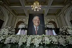 Around 1000 guests attended the 2.5-hour service, among whom were Lee's family members, the members of the funeral committee and foreign guests, including Keith J. Krach, US Under Secretary of State and Yoshiro Mori, former prime minister of Japan.[27] Hiroyasu Izumi, chief representative of Japan–Taiwan Exchange Association Taipei Office, read an eulogy on behalf of Shinzo Abe, the now former Japanese prime minister, who expressed respect to Lee for instilling universal values in Taiwan and forging the friendship between the two countries.[25][28] In a pre-recorded video, the 14th Dalai Lama shared his memories with Lee and praised him for his commitment to democracy and freedom and preservation of Chinese culture in Taiwan.[25][28]
