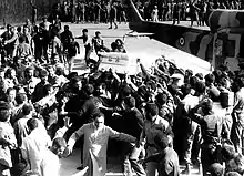 The crowd, much of it made up of Revolutionary Guards detailed to maintain order, pulled the coffin from the helicopter and began parading it around the makeshift compound surrounding the gravesite. As the excitement grew, the body of the Ayatollah, wrapped in a white burial shroud, fell out of the flimsy wooden coffin, and in a mad scene people in the crowd reached to touch the shroud. The soldiers pushed and wrestled, finally firing warning shots, to get the body back. Ayatollah Khomeini's son, Ahmad, was knocked from his feet. But even as the soldiers pushed the body back into the helicopter, the crowd swarmed over the craft, dragging it back down as it tried to take off. Others jumped into the hole dug for the Ayatollah's body. The troops drove the crowd back, finally clearing the compound enough to allow the helicopter to take off, its rotors scattering more mourners.[14]