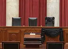 As has been tradition since as early as 1873 on the death of Chief Justice Salmon P. Chase, the courtroom doors of the Supreme Court, Ginsburg's seat, and the bench in front of her seat were draped in black.[23] On September 18, Speaker Nancy Pelosi of the House of Representatives ordered flags at the U.S. Capitol to be flown at half-staff in honor of Ginsburg.[24] On September 19, President Trump also ordered all U.S. flags at federal buildings to be flown at half-staff until Ginsburg's burial.[25]