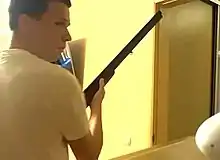 Andrei Zeltser in his apartment, holding a shotgun and glancing at the camera.