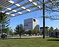 The vertical rods lining the outside of the building on all four sides are intended to be symbolic of the folds of a theater curtain. The rods comprising the facade are extruded anodized aluminum.[4]