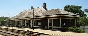 The first train station in Deerfield was a temporary boxcar installed by the Milwaukee Road in 1872.[4] Situated on Central Avenue, then called Hall Avenue, it was used as a temporary station while a permanent station was being constructed. The replacement structure was built about 2 blocks to the south of the current station and opened in 1872. The present station, which replaced both previous stations, was built in 1903 after a petition was circulated to have a train station closer to the center of the village.[5] Architect Jay W. Nettenstrom designed the station using American Craftsman and Prairie-style principles.[6] The station is similar in design to other stations along the Milwaukee Road, including the station in Walworth, Wisconsin.[7]
