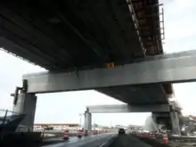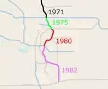 The province took over responsibility from the City of Calgary in 2000 to upgrade the route to a freeway and render the CANAMEX Corridor a contiguous route through the city, after which they intended to return the road to the city.[64][65] In 2003, a $100 million extension was completed extending Deerfoot Trail from its junction with Highway 22X to its present terminus near De Winton.[47] During planning, the segment had been temporarily designated as Highway 2X.[66] Prior to the 10-kilometre (6.2 mi) project, Deerfoot was effectively disconnected from the rest of Highway 2.[67] Traffic continuing south to Fort Macleod proceeded west on a two lane bridge carrying Highway 22X over the Bow River, before turning south onto Macleod Trail, which was then designated as Highway 2.[62] The section of Highway 22X over the river became Stoney Trail (Highway 201) in 2013,[46] and a second bridge was completed in 2007 to carry the westbound lanes, while the original bridge built in 1974 carries the eastbound lanes.[16]:109