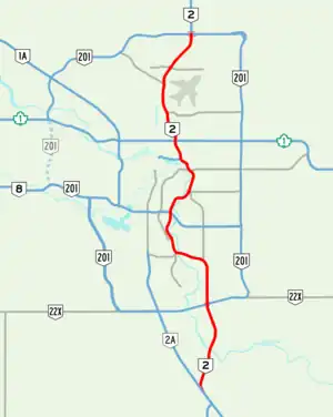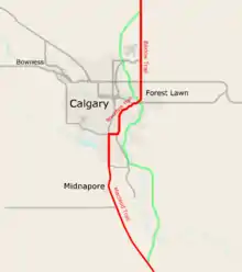 As a segment of Highway 2, Deerfoot Trail is a core route of the National Highway System and a key international corridor.[3] It is also part of Calgary's Primary Goods Movement Network and is identified as a skeletal road in the city's Transportation Plan, a limited-access route important for long distance travellers, and is the only route that stretches the entire length of the city from north to south.[4] From its split with Highway 2A (Macleod Trail) near the hamlet of De Winton in the south, it runs north to Stoney Trail at Calgary's northern city limit where it becomes the Queen Elizabeth II Highway.[5][6] The freeway roughly bisects the city, though it lies entirely east of Centre Street which officially marks the boundary between the east and west side of the city. From its southern terminus until Memorial Drive, Deerfoot approximates the course of the Bow River. Initially the freeway is on the east side, then crosses to the west bank, and finally back to the east before the river and Memorial Drive veer west at Inglewood towards downtown.[7] Most of the road's northern half parallels Nose Creek, a tributary of the Bow.[8]