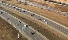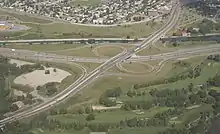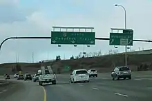 The freeway features 21 interchanges of varying design.[5] The most recent interchanges to be constructed at the north and south ends of the freeway are more consistently of the partial cloverleaf type, a design highly used in Alberta as it is a desirable compromise between cost and capacity. The two interchanges with Stoney Trail are cloverstack interchanges, where high capacity directional flyovers carry traffic turning left for movements with more traffic, and loop ramps service lesser used left turn movements.[41][42] Older and less efficient designs are used at Deerfoot's intersections with both Glenmore Trail and Highway 1. The junction with Glenmore is an incomplete cloverleaf interchange; traffic northbound on Deerfoot does not have direct access to westbound Glenmore and one must first exit to the east, proceed through a traffic light behind Calgary Auto Mall, and enter Glenmore Trail from the north side.[7] At Highway 1, a split diamond interchange significantly slows east-west traffic even outside of peak hours, because all left turn movements must pass through three sets of traffic lights.[43] This outdated interchange was Calgary's most dangerous road junction in 2011, with 234 crashes recorded.[14]