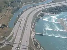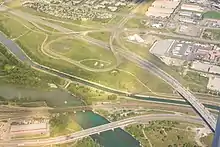 Immediately after the river, Deerfoot merges with the major routes of Anderson Road and Bow Bottom Trail, often a point of congestion at rush hour. In both directions, traffic through the outdated interchange is reduced from three lanes to two.[20] The freeway curves north along the river's west bank to cross Southland Drive, paralleling Blackfoot Trail near the community of Acadia.[7] North of Acadia, the freeway bisects a large area of commercial development for several kilometres before reaching a major interchange at Glenmore Trail.[21] The interchange is generally identified as the second of two major congestion points on Deerfoot in south Calgary, the so called "Glenmore squeeze", where traffic is reduced to two lanes each way over Glenmore.[22] Deerfoot turns sharply to the east and again crosses the Bow River on the Calf Robe Bridge, named after a Siksika Nation elder.[14] Veering back to the north, it follows the river's east bank across Peigan Trail to a partial cloverleaf interchange at 17 Avenue SE, passing the neighbourhoods of Dover and Southview. Deerfoot meets Memorial Drive, a major freeway spur into downtown, near Pearce Estate Wetland, Wilder Institute/Calgary Zoo and the Max Bell Centre, and continues into north Calgary while the Bow River turns west towards downtown.[7][23]