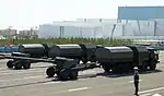 2015 celebrated the 23rd anniversary of the Kazakh Armed Forces and the platinum jubilee (70th anniversary) of the Great Patriotic War.[19][20][21] Noting the timing of the parade with the anniversary, President Nazarbayev said that it "shows the continuity of military traditions between the World War II winners and the current generation of defenders of our land."[22] Minister of Defence Imangali Tasmagambetov accompanied President Nazarbayev in his inspection of the troops during the parade. An exact copy of the Victory Banner, was delivered to Astana from the Museum of Great Patriotic War in Moscow. It consisted of two parts – historic and contemporary, with the former being represented by troops depicting Kazakh field units of the Red Army, including the 72nd Guards Rifle Division that was raised in Akmolinsk (now Astana) in 1942. The legendary Katyusha rocket launcher was presented at the parade for the first time.[23] Military pilots performed aerobatics singly and as part of aerobatic teams, and also built the number "70", which symbolizes the anniversary of the Great Victory.[24]