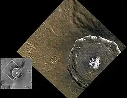 ![]() Degas crater, MESSENGER spacecraft image, 2011. Inset is Mariner 10 image from 1974. | |