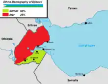 The ethnic composition of Djibouti is 56.2% Somali, 24.2% Afar, 15.6% Arabs, 6.675% Djibouti Arabs (indigenous), 4.525% Yemenis, 4.4% Omanis and 5% others. The Somali clan component is mainly composed of the Issa clan (Dir), followed by the Gadabuursi and the Isaaq.[5]