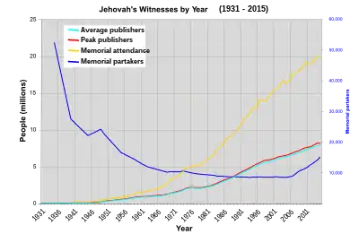 A chart of active Jehovah's Witnesses by year, 1931-2015