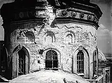 During the spring of 1935, the golden domes of the monastery were pulled down. The cathedral's silver royal gates, Mazepa's reliquary—weighing two poods of silver—and other valuables were sold abroad or simply destroyed.[6]