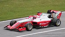 Hauger secured his best qualifying yet in Baku with third position. He crashed out of the Sprint Race when he suffered a huge lock up and ran nose first into the wall, but he redeemed himself by winning his first Feature Race the next day.[38] He qualified 12th in Silverstone and finished in 15th place in the Sprint Race. He retired in the Feature Race after a collision with Roy Nissany.[39][40][41] In Austria, he qualified in 15th position, but managed to finish 9th in the Sprint Race. He began the Feature Race on slick tyres which saw him pass multiple drivers who were on wets as the track dried; he eventually finished fourth after a string of drivers received penalties.[42]