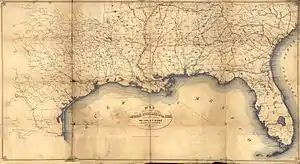 The department, frequently referred to as the Gulf District, was established on July 2, 1862, as a part of Department No. 2; its area was defined as the coast from the Pearl River to the Apalachicola River northward to latitude 32° north. On November 3, 1863, the northern boundary was extended to latitude 33° north. On July 25, 1863, the department/district was transferred to the Department of Mississippi and Eastern Louisiana.[3] It remained in that department only until January 28, 1864, when it was transferred to the Department of Alabama and Eastern Mississippi.[3] Upon being transferred, the department/district boundaries were redefined as beginning at the mouth of the Pearl River, running north to latitude 32° north, east to the Georgia State line and south to the Gulf of Mexico.[3] On May 8, 1864, the boundary was again modified to define the eastern edge as being the intersection of latitude 32° north with a line running from the junction of the Coosa and Tallapoosa to point where the Choctawhatchee River entered Florida then following the Choctawhatchee to its mouth on the Gulf of Mexico.[3] The department/district surrendered on May 4, 1865.[3]