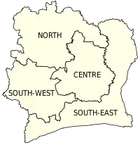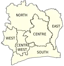 Departments were established in 1961 and were the original first-level administrative subdivision of independent Ivory Coast.[3] Initially, there were just four departments: Centre, Nord, Sud-Est, and Sud-Ouest. In 1963, two more departments were created: Est was created by dividing Sud-Est, and Centre-Ouest) was created by dividing Sud-Ouest. As a result of the divisions, Sud-Est was renamed Sud and Sud-Ouest was renamed Ouest.