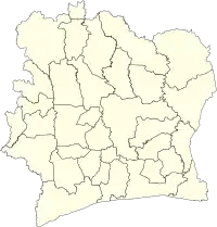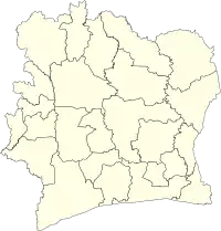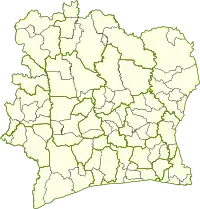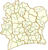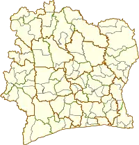 Departments of Ivory Coast (French: départements de Côte d'Ivoire) are currently the third-level administrative subdivision of the country. Each of the 31 second-level regions of Ivory Coast is divided into two or more departments. (The autonomous districts are containing departments, but have a specific status.) Each department is divided into two or more sub-prefectures. Since 2020, there are 109 departments of Ivory Coast.