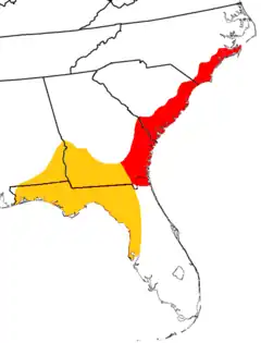 The Gulf coast of Florida from the Aucilla River to the Anclote River, extending 15 miles (24 km) to 20 miles (32 km) inland.[9]