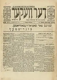 During its first years, Der Veker was an organ of the General Jewish Labour Bund.[2][3] Der Veker was the first legal bundist newspaper to be published in Minsk.[3] The first issue was published on May 12, 1917.[3][4] As Yiddish-language publishing bloomed in Minsk in 1917, Der Veker emerged as the most important Yiddish newspaper of the city.[4] Initially it was published thrice weekly, on June 1, 1917, it became a daily newspaper.[2] The name was taken from the Bund organ in Vilna published during the Russian Revolution of 1905.[4]