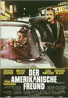 The American Friend (German: Der amerikanische Freund) is a 1977 neo-noir film by Wim Wenders, adapted from the 1974 novel Ripley's Game by Patricia Highsmith. The film features Dennis Hopper as career criminal Tom Ripley and Bruno Ganz as Jonathan Zimmermann, a terminally ill picture framer whom Ripley coerces into becoming an assassin. The film uses an unusual "natural" language concept: Zimmermann speaks German with his family and his doctor, but English with Ripley and while visiting Paris.
