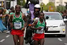 He recovered from this setback by winning his first marathon in April 2010, taking the men's title at the Daegu Marathon.[8] He tried his hand at the shorter half marathon distance in November, running at the New Delhi Half Marathon, but finished 14th in a large field with a time of 62:22 minutes.[9] He attended the Dubai Marathon for a third year running and took fourth in a time of 2:09:08 hours.[10] He ran in his first World Marathon Majors event that April, entering the 2011 Boston Marathon and in a very fast race (Geoffrey Mutai ran a world's best time on the downhill course) he managed eighth place.[11]