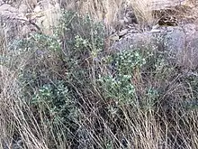 This shrub grows up to 2 meters in height and has leathery, silver-haired leaves and purple flowers.[1]
