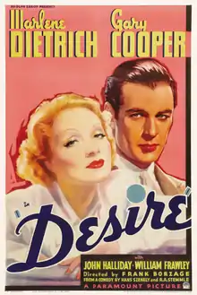 Desire is a 1936 American romantic crime comedy-drama film directed by Frank Borzage, starring Marlene Dietrich and Gary Cooper, and produced by Borzage and Ernst Lubitsch. The picture is a remake of the 1933 German film Happy Days in Aranjuez. The screenplay was written by Samuel Hoffenstein, Edwin Justus Mayer, and Waldemar Young, based on the play Die Schönen Tage von Aranjuez by Hans Székely and Robert A. Stemmle. The music score was composed by Frederick Hollander and the cinematography was shot by Charles Lang and Victor Milner. Marlene Dietrich's wardrobe was designed by Travis Banton. The supporting cast features John Halliday, William Frawley, Akim Tamiroff, and Alan Mowbray.