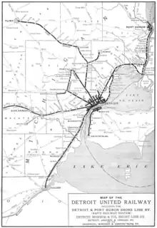 The Detroit United Railway was a transport company which operated numerous streetcar and interurban lines in southeast Michigan. Although many of the lines were originally built by different companies, they were consolidated under the control of the Everett-Moore syndicate, a Cleveland-based group of investors. The company incorporated on December 31, 1900, and continued to expand into the early 1920s through new construction and the acquisition of smaller concerns. After the DUR acquired the Detroit-Jackson line in 1907, it operated more than 400 miles (640 km) of interurban lines and 187 miles (301 km) of street city street railway lines.