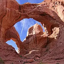 Devils Garden[note 1] is an area of Arches National Park, located near Moab, Utah, United States,[2] that features a series of rock fins and arches formed by erosion.[3] The Devils Garden Trail, including more primitive sections and spurs, meanders through the area for 7.2 mi (11.6 km).[4] The trailhead leads directly to Landscape Arch after a 0.8 mi (1.3 km) outbound hike, while Tunnel Arch and Pine Tree Arch can be seen on spur trails on the way to Landscape Arch.[3] Several other arches, including Partition, Navajo, Double O, and Private Arch, as well as the Dark Angel monolith and Fin Canyon, are accessed via the primitive loop trail and its spurs.[3]
