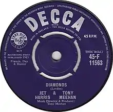 "Diamonds" is an instrumental composed by Jerry Lordan and first released as a single by Jet Harris and Tony Meehan in January 1963. It became a number-one hit on the UK Singles Chart, spending three weeks at the top of the chart.[3]