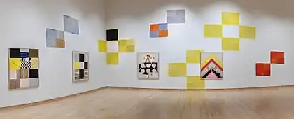 Critics situate Guerrero-Maciá's work at the intersection of painting, fiber, design and conceptual art traditions, noting its blurring of such boundaries and refusal of binaries such as "high" modernism or craft, formal severity or kitsch playfulness, geometric, hard-edged or biomorphic, pliable forms, the metaphysical or quotidian.[23][6][3][7] She works in two- and three-dimensional media, with a long history of hybrid techniques including collage, assemblage, sewing and dyeing, sampling and appropriation inspired by the work of artists such as Robert Rauschenberg and the Pattern and Decoration movement.[21][3][7]