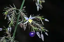 Dianella tasmanica, commonly known as the Tasman flax-lily[2] or Tasmanian flax-lily[3] is a herbaceous strappy perennial herb of the family Asphodelaceae, subfamily Hemerocallidoideae, found in southeastern Australia including Tasmania. It has leaves to 80 cm, and a flower stem to 1.5 m.[4] Blue flowers in spring and summer are followed by violet berries. It adapts readily to cultivation and is commonly seen in Australian gardens. Unlike other Dianella species, its fruit is toxic.[5]